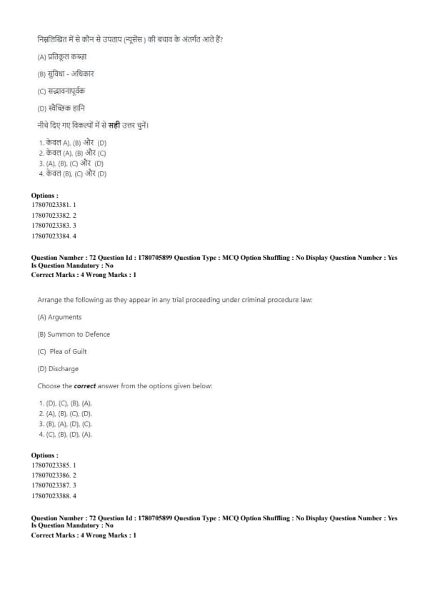 The correct order is: (B), (A), (D), (C). Quick Tip: In criminal trials, the process follows discharge, plea, defence summons, and then arguments.