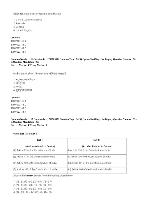 - Indian federation closely resembles the Canadian model, which is a federal system with a strong central government and distribution of powers between Union and States. Quick Tip: India’s federal structure is inspired by the British Parliament and Canadian federal model.