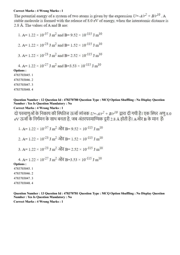 The potential energy of a system of two atoms is given by the expression \( U = -A/r^2 + B/r^{10} \). A stable molecule is formed with the release of 8.0 eV of energy, when the interatomic distance is 2.8 Å. The values of A and B are: