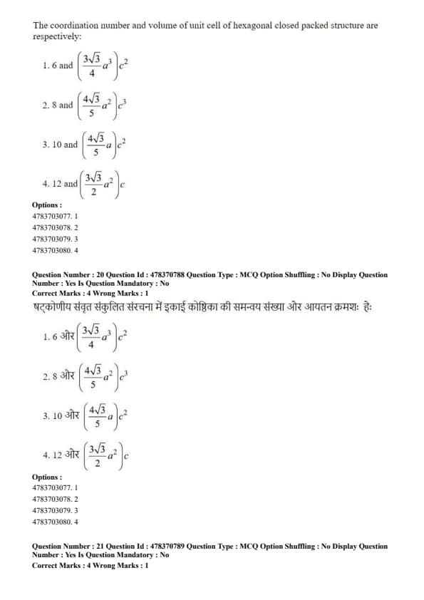 The coordination number and volume of unit cell of hexagonal closed packed structure are respectively: