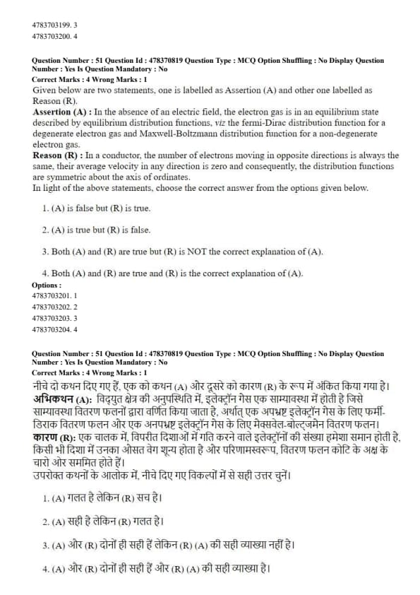 Assertion (A): In the absence of an electric field, the electron gas is in an equilibrium state described by equilibrium distribution functions, viz the fermi-Dirac distribution function for a degenerate electron gas and Maxwell-Boltzmann distribution function for a non-degenerate electron gas.