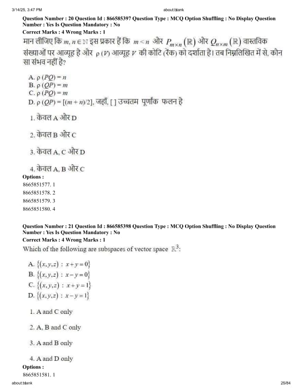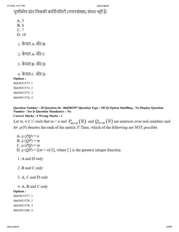 Let \(m, n \in \mathbb{N}\) such that \(m < n\) and \(P_{m \times n}(\mathbb{R})\) and \(Q_{n \times m}(\mathbb{R})\) are matrices over real numbers and let \(\rho(V)\) denotes the rank of the matrix V. Then, which of the following are NOT possible.