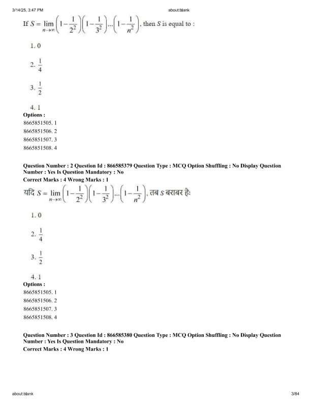 If \( S = \lim_{n \to \infty} \left(1-\frac{1}{2^2}\right)\left(1-\frac{1}{3^2}\right) \dots \left(1-\frac{1}{n^2}\right) \), then S is equal to: