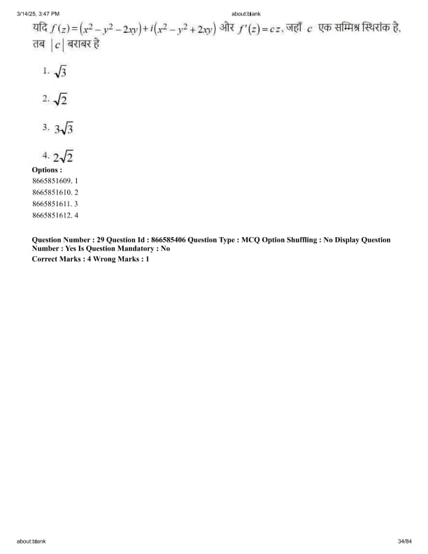 If \( f(z) = (x^2-y^2-2xy) + i(x^2-y^2+2xy) \) and \( f'(z)=cz \), where c is a complex constant, then \( |c| \) is equals to: