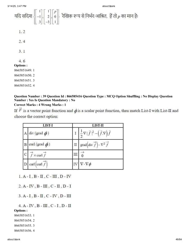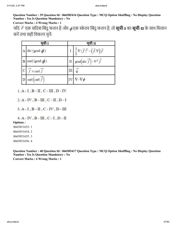If \( \vec{F} \) is a vector point function and \( \phi \) is a scalar point function, then match List-I with List-II and choose the correct option:
