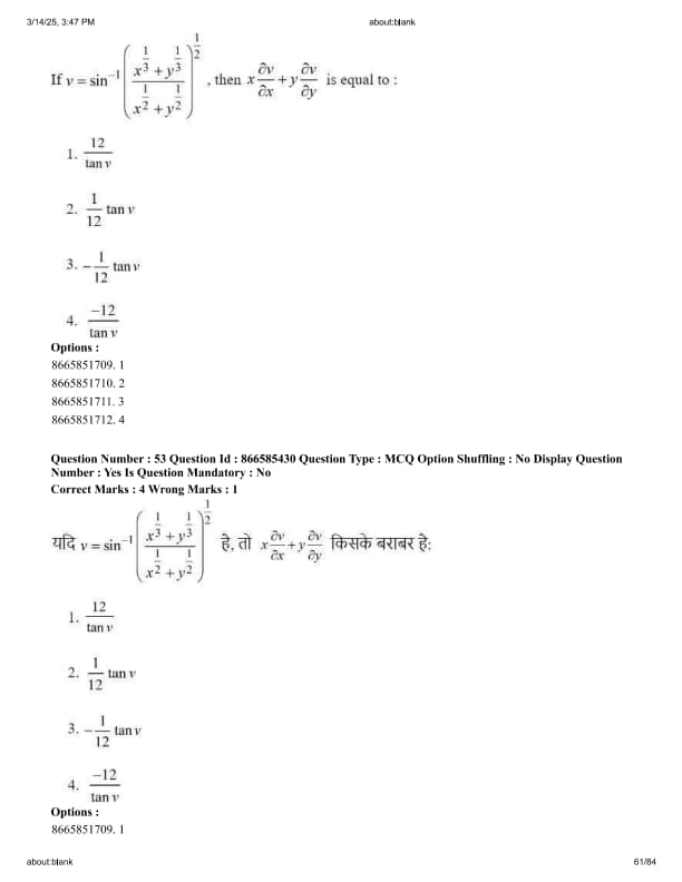 If \( v = \sin^{-1} \left( \frac{x^{1/3} + y^{1/3}}{x^{1/2} + y^{1/2}} \right) \), then \( x\frac{\partial v}{\partial x} + y\frac{\partial v}{\partial y} \) is equal to :