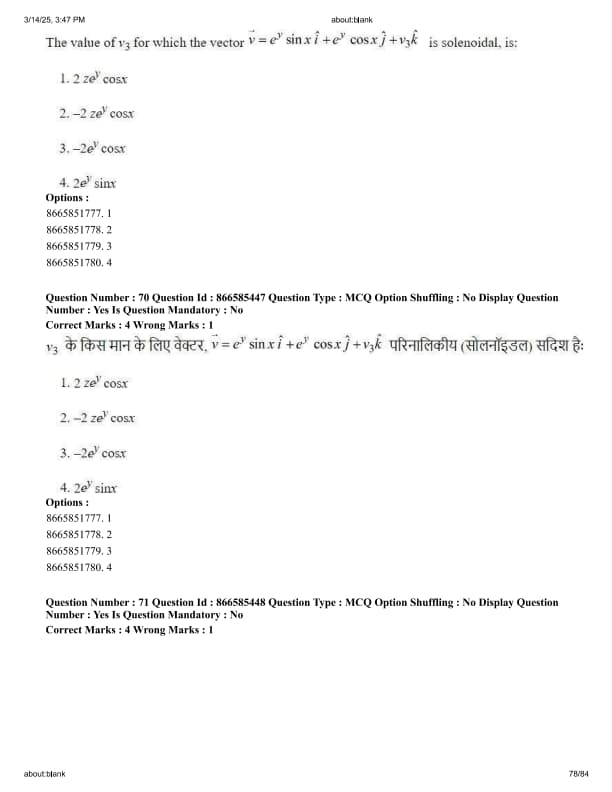 The value of \( v_3 \) for which the vector \( \vec{v} = e^y \sin x \hat{i} + e^y \cos x \hat{j} + v_3 \hat{k} \) is solenoidal, is: