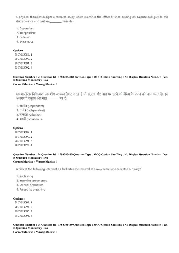 - (1) Dependent: Correct. Balance and gait are the outcomes being measured in this study, making them dependent variables that depend on the effect of knee bracing.