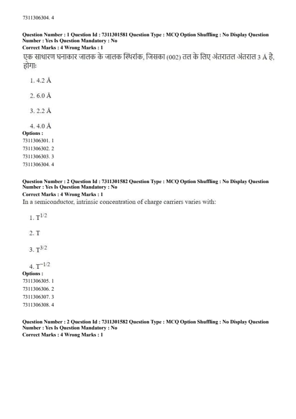 The options provided are power-law dependencies on \(T\). The pre-exponential factor in the expression for \(n_i\) is \(T^{3/2}\), which matches option (3). Quick Tip: While the exponential term \(\exp(-E_g / 2k_B T)\) causes the most significant change in carrier concentration with temperature, the pre-exponential \(T^{3/2}\) term is also a fundamental part of the relationship derived from the density of states. Always check if this term is among the options.