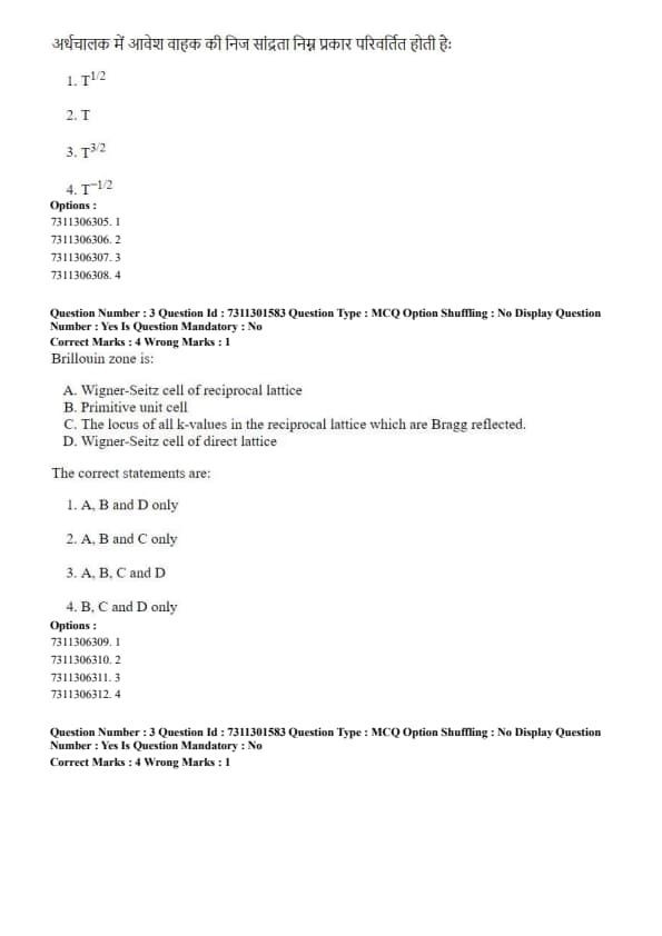Statements A, B, and C are correct descriptions of the Brillouin zone. Statement D is incorrect. Therefore, the correct option includes A, B, and C only. Quick Tip: The key to understanding the Brillouin zone is to remember that it lives in "reciprocal space" or "k-space," not real space. It is the Wigner-Seitz cell of the reciprocal lattice, and its boundaries are directly related to the condition for Bragg diffraction.