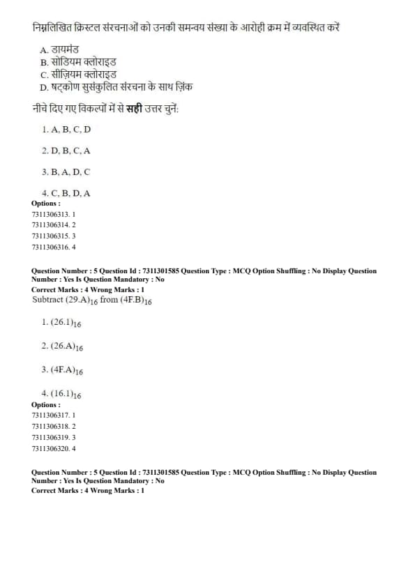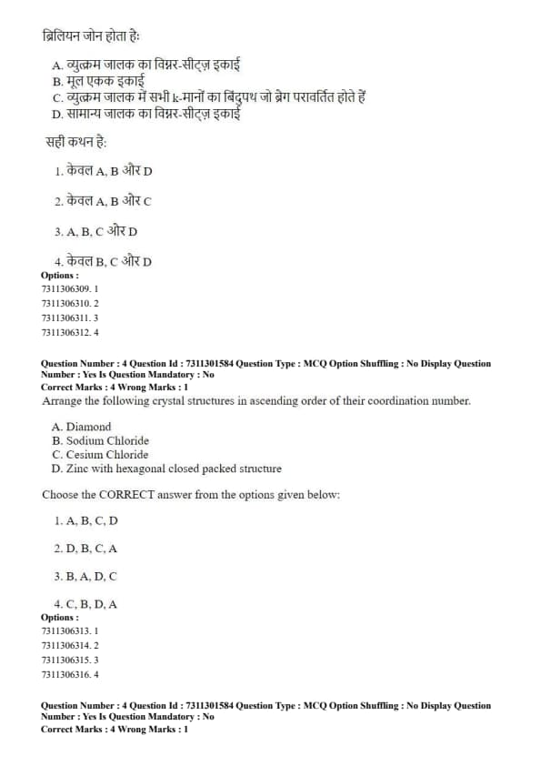 The correct order is A, B, C, D. Quick Tip: Memorize the coordination numbers for common crystal structures: Diamond (4), NaCl (6), BCC/CsCl (8), and HCP/FCC (12). This is a frequent topic in solid-state physics questions.