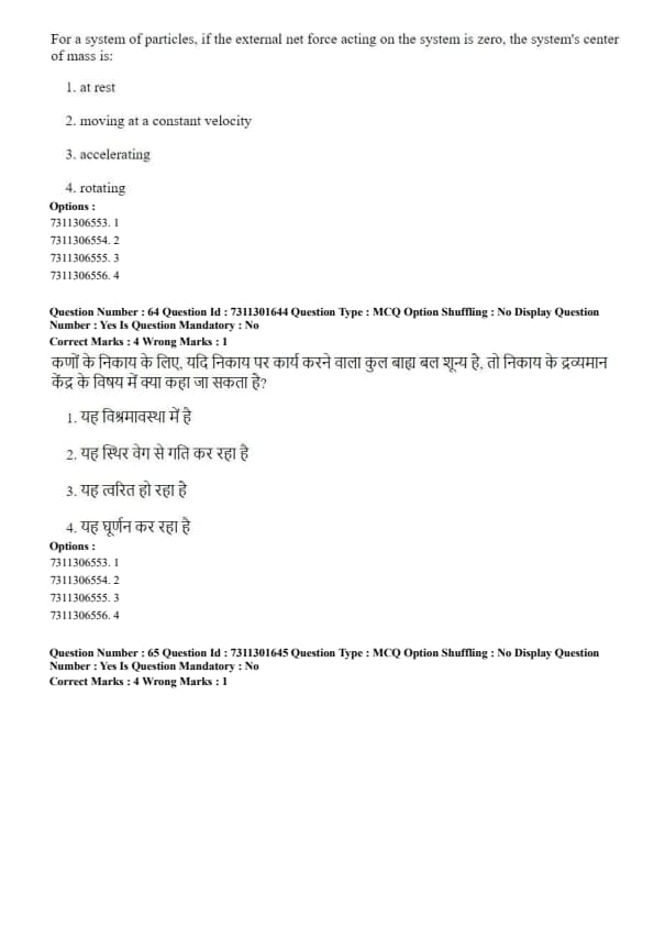 Zero acceleration means that the velocity of the center of mass, \(\vec{v}_{CM}\), does not change. This means the center of mass moves at a constant velocity. Being "at rest" is a special case of moving at a constant velocity where the constant velocity is zero. Option (2) is the more general and correct statement. Quick Tip: This is a statement of the conservation of momentum for a system. If the net external force is zero, the total momentum of the system (\(M\vec{v}_{CM}\)) is conserved.
