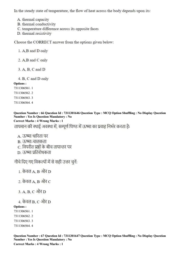 The steady-state flow of heat depends on thermal conductivity (B), temperature difference (C), and thermal resistivity (D). Quick Tip: Think of the analogy with electrical circuits (Ohm's Law, \(I = V/R\)): - Heat Flow \(H \leftrightarrow\) Current \(I\) - Temperature Difference \(\Delta T \leftrightarrow\) Voltage \(V\) - Thermal Resistance \(R_T = L/(kA) \leftrightarrow\) Electrical Resistance \(R\) Thermal capacity is analogous to electrical capacitance, which is irrelevant for steady DC current.
