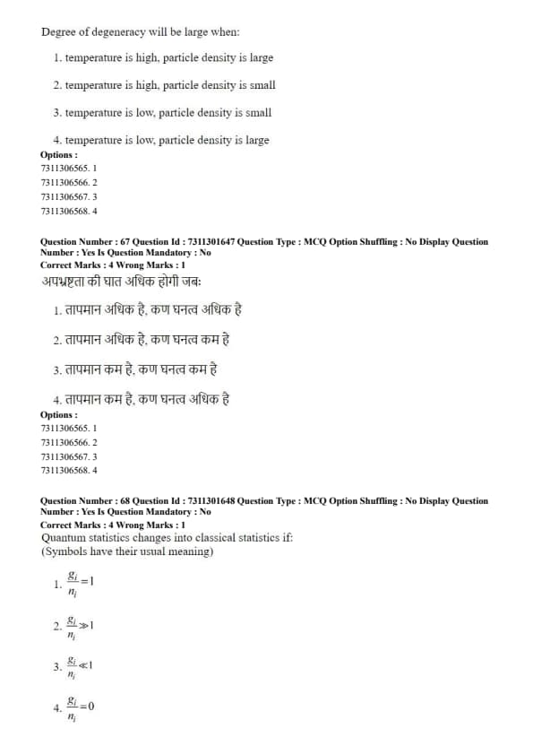 Therefore, the system becomes degenerate (the degree of degeneracy is large) when the temperature is low and the particle density is high. This forces particles to occupy higher energy states (for fermions) or crowd into the ground state (for bosons), which are distinctly quantum behaviors. Quick Tip: Degeneracy in this context means "quantum-ness." Quantum effects dominate when particles are cold (slow-moving, large de Broglie wavelength) and crowded (small inter-particle spacing).