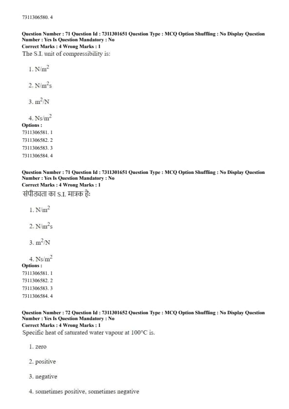 Since compressibility is the reciprocal of bulk modulus, its unit is the reciprocal of the unit of pressure. \[ Unit of \kappa = \frac{1}{Unit of B} = \frac{1}{N/m^2} = \frac{m^2}{N} \] Quick Tip: Remembering that compressibility is the inverse of stiffness (bulk modulus) is key. Stiff materials have a high bulk modulus and low compressibility, while easily compressed materials have a low bulk modulus and high compressibility.