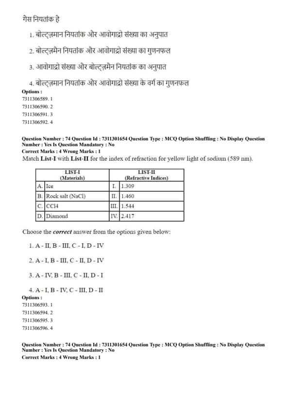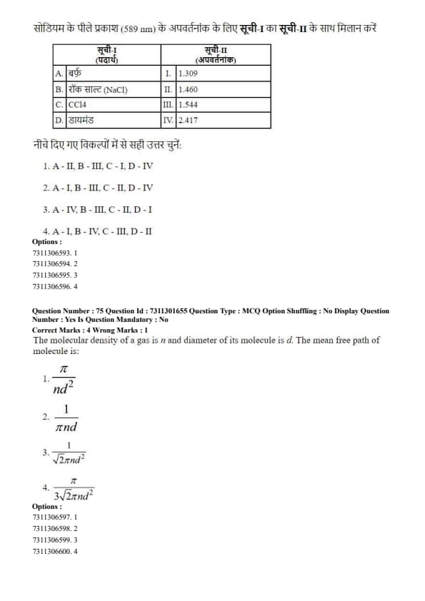 The correct set of matches is A - I, B - III, C - II, D - IV. Quick Tip: It's useful to have a mental scale of refractive indices: - Air: \(\approx\) 1.00 - Water/Ice: \(\approx\) 1.3 - Common Glass/Plastics/Liquids: \(\approx\) 1.4 - 1.6 - Diamond/High-index materials: > 2.0