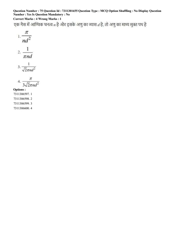 where \(n\) is the number density of molecules and \(d\) is the molecular diameter. Quick Tip: The mean free path is inversely proportional to the density of the gas (\(n\)) and the collision cross-section (\(\pi d^2\)). A denser gas or larger molecules will lead to a shorter mean free path. The \(\sqrt{2}\) factor is a crucial correction that arises from considering the relative speeds of the colliding molecules.