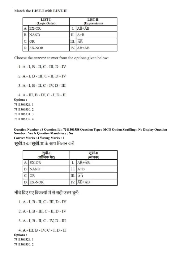 - D. EX-NOR: The Exclusive-NOR gate outputs true only when the inputs are the same. Its expression is \( \overline{A \oplus B} = AB + \bar{A}\bar{B} \). This matches expression IV. So, D \(\rightarrow\) IV.