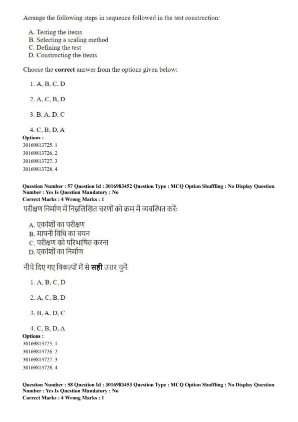 Arrange the following steps in sequence followed in the test construction: