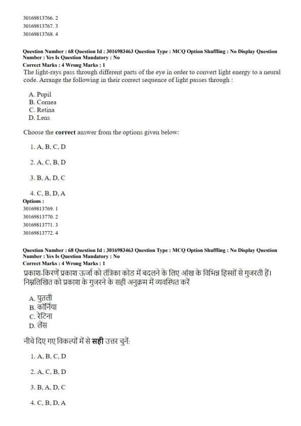 The light-rays pass through different parts of the eye in order to convert light energy to a neural code. Arrange the following in their correct sequence of light passes through: