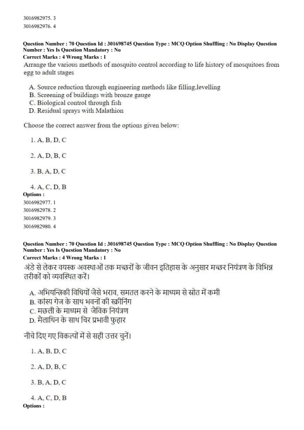 Arrange the various methods of mosquito control according to life history of mosquitoes from egg to adult stages: