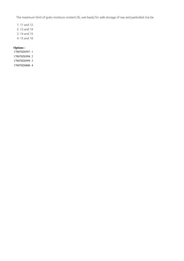 The maximum limit of grain moisture content (% wet basis) for safe storage of raw and parboiled rice be: