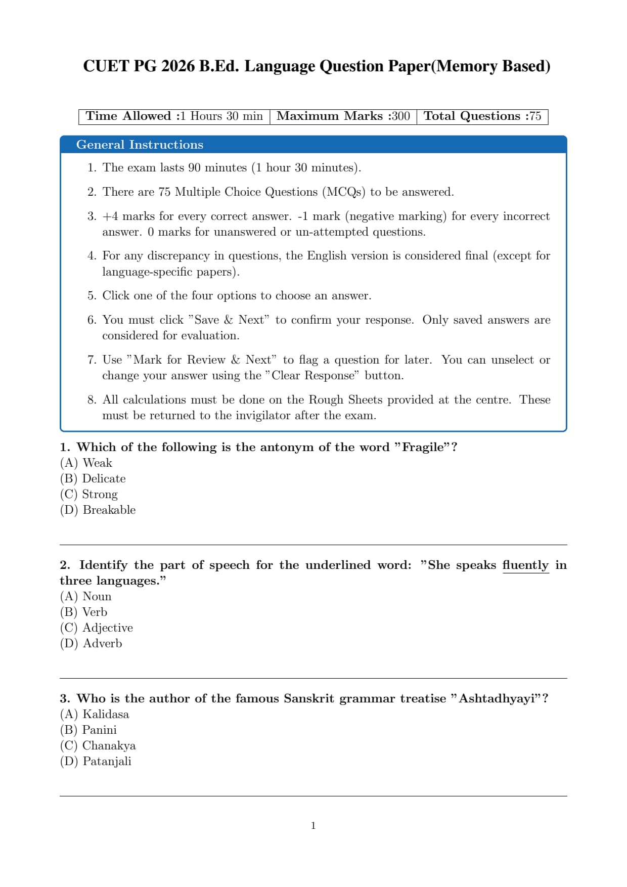 CUET PG 2026 B.Ed. Languages Question Paper with Solutions PDF
