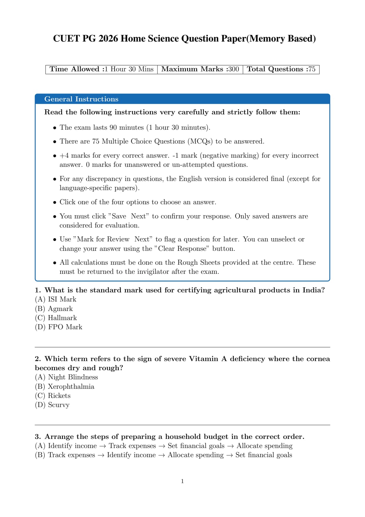| CUET PG 2026 Home Science Question Paper with Answer key | Download PDF | Check Solutions |