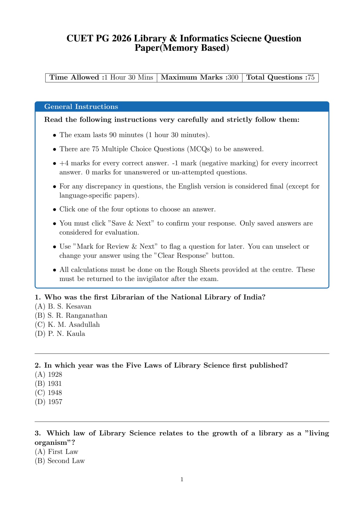 | CUET PG 2026 Library and Information Science Question Paper with Answer Key | Download PDF | Check Solutions |