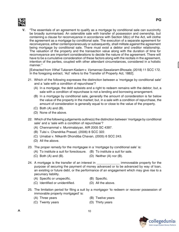 | 23 | The proper remedy for the mortgagee in a ‘mortgage by conditional sale’ is: (A) To institute a suit for foreclosure. (B) To institute a suit for sale. (C) Both (A) and (B). (D) Neither (A) nor (B). |