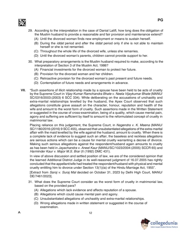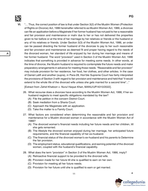 | 28 | What does the term “provision” in Section 3 of the Muslim Women Act, 1986, imply? (A) Retrospective financial support to be provided to the divorced wife. (B) Provision made for her future till she is qualified to earn on her own. (C) Provision for meeting all her future needs. (D) Provision for her future until she is qualified to earn or get married. |