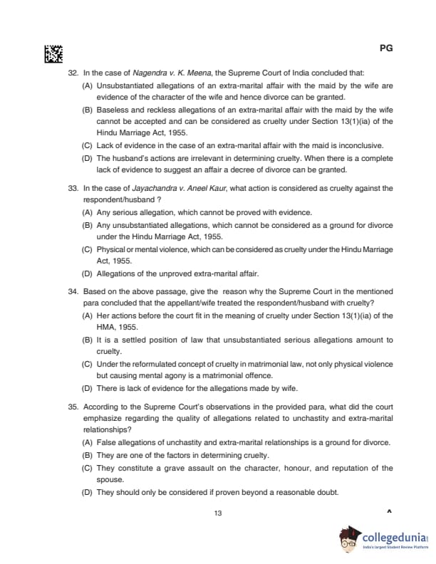 | 32 | In the case of Nagendra v. K. Meena, the Supreme Court of India concluded that: (A) Unsubstantiated allegations of an extra-marital affair with the maid by the wife are evidence of character of the wife and hence divorce can be granted. (B) Baseless and unsubstantiated allegations of an extra-marital affair with the maid by the wife cannot be accepted and can be considered as cruelty under Section 13(1)(ia) of the Hindu Marriage Act, 1955. (C) Lack of evidence of an extra-marital affair with the maid is inconclusive. (D) The husband’s actions are irrelevant in determining cruelty. When there is a complete lack of evidence to suggest an affair, a decree of divorce can be granted. |
