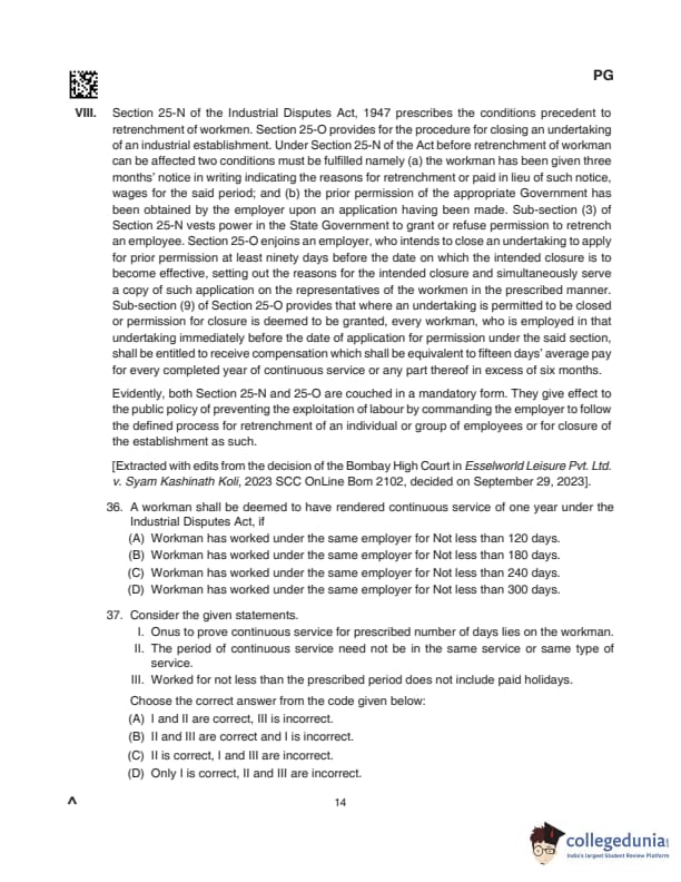 | 37 | Consider the given statements. I. Onus to prove continuous service for the prescribed number of days lies on the workman. II. The period of continuous service need not be in the same service or same type of service. III. Worked for not less than the prescribed period does not include paid holidays. Choose the correct answer from the code given below: (A) I and II are correct, III is incorrect. (B) II and III are correct, I is incorrect. (C) I is correct, II and III are incorrect. (D) Only I is correct, II and III are incorrect. |