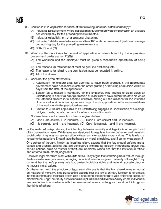 | 40 | Consider the given statements. I. Application for closure shall be deemed to have been granted if the appropriate government does not communicate the order granting or refusing permission within 30 days from the date of the application. II. Section 25-O makes it mandatory for the employer, who intends to close down an undertaking, to apply for prior permission at least ninety days before the date on which the intended closure is to become effective, setting out the reasons for the intended closure and to simultaneously serve a copy of such application on the representatives of the workmen in the prescribed manner. III. Section 25-O is not applicable to an undertaking engaged in the construction of buildings, bridges, roads, canals, dams or for other construction work. Choose the correct answer from the code given below: (A) I and II are correct, III is incorrect. (B) II and III are correct, I is incorrect. (C) I is correct, II and III are incorrect. (D) Only I is correct, II and III are incorrect. |