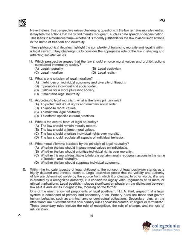| 41 | Which perspective argues that the law should enforce moral values and prohibit actions considered immoral by society? (A) Legal neutrality (B) Legal positivism (C) Legal moralism (D) Legal realism |