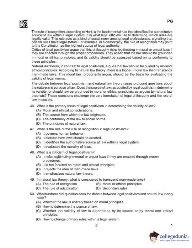| 46 | What is the primary focus of legal positivism in determining the validity of law? (A) Moral and ethical considerations. (B) The source from which the law originates. (C) The conformity of the law to social norms. (D) The principles of natural law. |