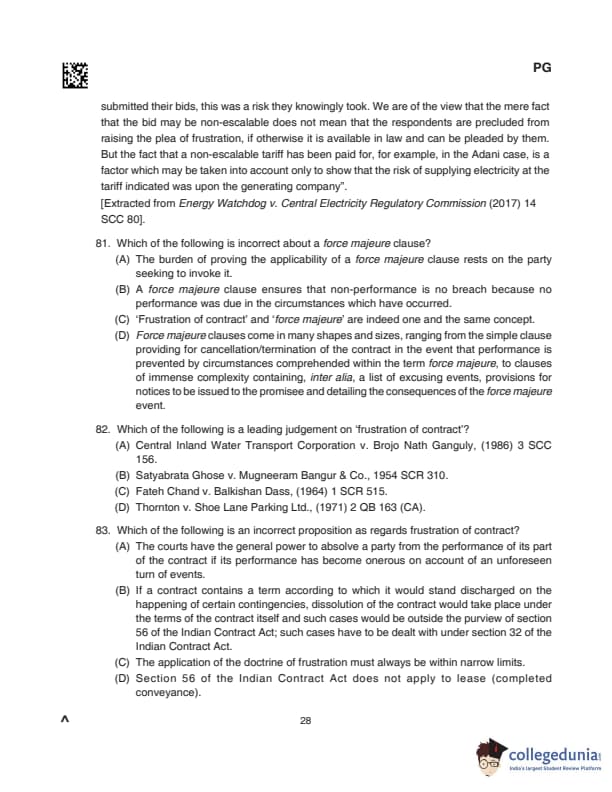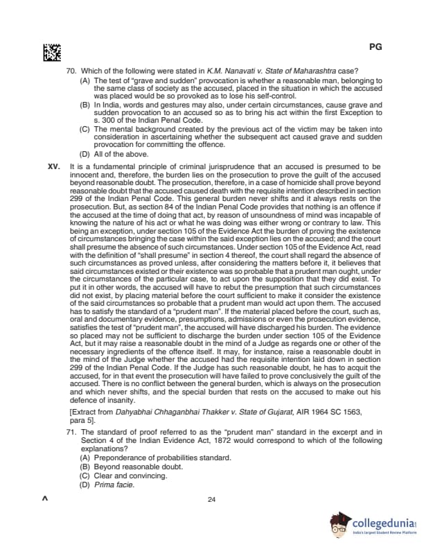 | 12 | Which of the following propositions is incorrect as regards negligence? (A) The test for determining medical negligence, as laid down in Bolam case [Bolam v Friern Hospital Management Committee, (1957) 1 WLR 582], holds good in its applicability in India. (B) The jurisprudential concept of negligence is the same in civil and criminal law, and anything that may be negligence in civil law is necessarily a negligence in criminal law. (C) A professional may be held liable for negligence, and the standard to be applied for judging whether the person charged has been negligent or not, would be that of an ordinary competent person exercising ordinary skill in that profession. (D) It is not possible for every professional to possess the highest level of expertise or skills, which is not the test in negligence; a highly skilled professional may be possessed of better qualities, but that cannot be made the basis or the yardstick for judging the performance of the professional proceeded against on incident of negligence. |