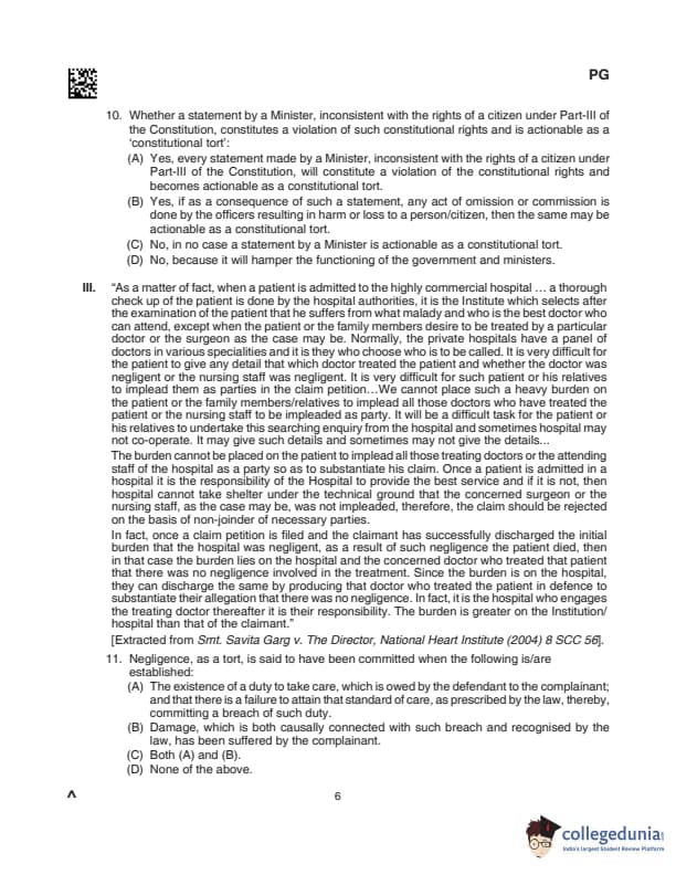 | 15 | Now, a large number of private hospitals, nursing homes and clinics have emerged. In view of the good reputation they have built, patients go there for treatment in large numbers. These hospitals provide the medical treatment to those patients through doctors employed by those hospitals, though there on some arrangement. These hospitals hold out to the public that the treatment would be given by doctors provided to those patients by all such doctors. In such cases, if the patient suffers injury due to negligence of the doctors, then: (A) The hospitals would be equally liable for damages, on the principles of vicarious liability as they have held out the doctors as their employees, and those hospitals cannot show off their responsibility and liability to pay compensation for the damages suffered by the patients due to negligence of the doctors provided by these very hospitals. (B) The hospitals would not at all be held liable for damages. (C) The hospitals would not at all be held liable for damages; but the doctors could not show off their liability for negligence. (D) Neither the hospitals nor the doctors are held liable, as no one can guarantee the desired results in medical treatment. |