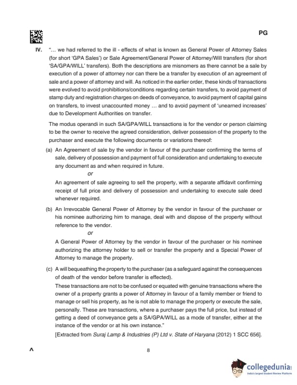 | 19 | In relation to the sale of immovable property, in Suraj Lamp Industries (P) Ltd v. State of Haryana, the Court held that as per the Transfer of Property Act, 1882: (A) Transactions in the nature of ‘GPA sales’ or ‘SA/GPA/WILL transfers’ do convey legal title in the immovable property. (B) Transactions in the nature of GPA sales are legally and lawfully transferred/conveyed only by a registered deed of conveyance. (C) The Court was in favour of ‘GPA sales’ or ‘SA/GPA/WILL transfers’ as also recognised modes of transfer of immovable property. (D) The Court ruled ‘GPA sales’ or ‘SA/GPA/WILL transfers’ as completed or concluded transfers of ownership in immovable property. |