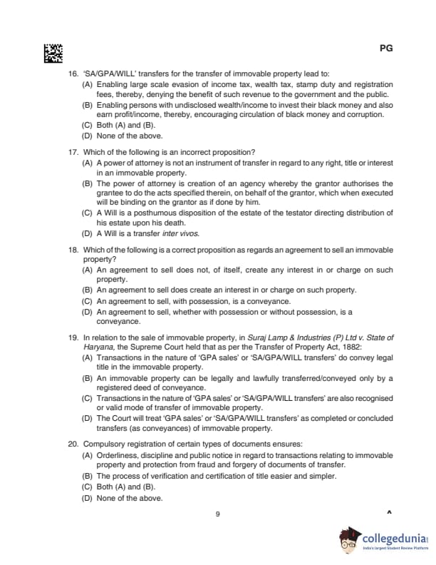 | 16 | ‘SA/GPA/WILL’ transfers for the transfer of immovable property lead to: (A) Enabling large scale evasion of income tax, wealth tax, stamp duty and registration fees, thereby, denying the benefit of such revenue to the government and the public. (B) Enabling persons with undisclosed wealth/income to invest their black money and also earn profit/income, thereby, encouraging circulation of black money and corruption. (C) Both (A) and (B). (D) None of the above. |
