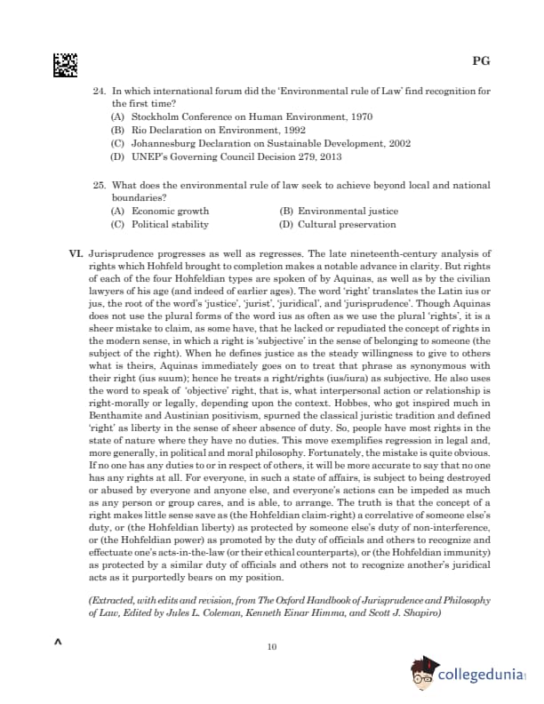 | 24. In which international forum did the ‘Environmental rule of Law’ find recognition for the first time? (A) Stockholm Conference on Human Environment, 1970 (B) Rio Declaration on Environment, 1992 (C) Johannesburg Declaration on Sustainable Development, 2002 (D) UNEP’s Governing Council Decision 279, 2013 |