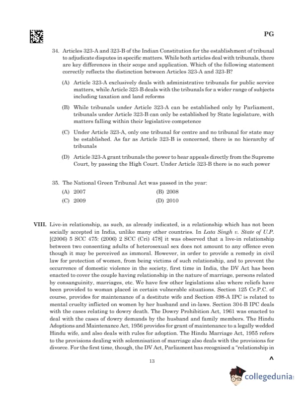 | 34. Articles 323-A and 323-B of the Indian Constitution for the establishment of tribunal to adjudicate disputes in specific matters. While both articles deal with tribunals, there are key differences in their scope and application. Which of the following statement correctly reflects the distinction between Articles 323-A and 323-B? (A) Article 323-A exclusively deals with administrative tribunals for public service matters, while Article 323-B deals with the tribunals for a wider range of subjects including taxation and land reforms (B) While tribunals under Article 323-A can be established only by Parliament, tribunals under Article 323-B can only be established by State legislature, with matters falling within their legislative competence (C) Under Article 323-A, only one tribunal for centre and no tribunal for state may be established. As far as Article 323-B is concerned, there is no hierarchy of tribunals (D) Article 323-A grant tribunals the power to hear appeals directly from the Supreme Court, by passing the High Court. Under Article 323-B there is no such power |