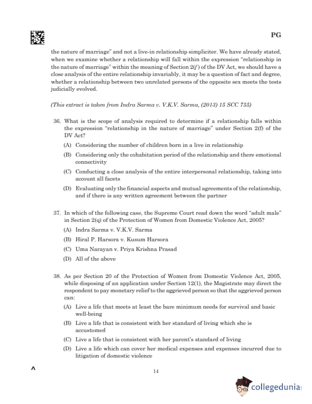 Comprehension: Read MoreIn *Indra Sarma v. V.K.V. Sarma*, it was noted that while live-in relationships are not offences, the DV Act was enacted to protect women in such arrangements, provided the relationship qualifies as "in the nature of marriage" under Section 2(f). Other statutes like Section 125 Cr.P.C., Section 498-A IPC, and the Dowry Prohibition Act address women’s rights and protection in specific contexts, such as maintenance, mental cruelty, and dowry-related offences. The Hindu Adoptions and Maintenance Act and the Hindu Marriage Act address maintenance, marriage solemnisation, and divorce for legally wedded Hindu wives. The judgment emphasized the need for a detailed examination of facts to determine whether a relationship qualifies as one "in the nature of marriage," as opposed to a live-in relationship simpliciter. (A) Considering the number of children born in a live-in relationship (B) Considering only the cohabitation period of the relationship and their emotional connectivity (C) Conducting a close analysis of the entire interpersonal relationship, taking into account all facets (D) Evaluating only the financial aspects and mutual agreements of the relationship, and if there is any written agreement between the partner |