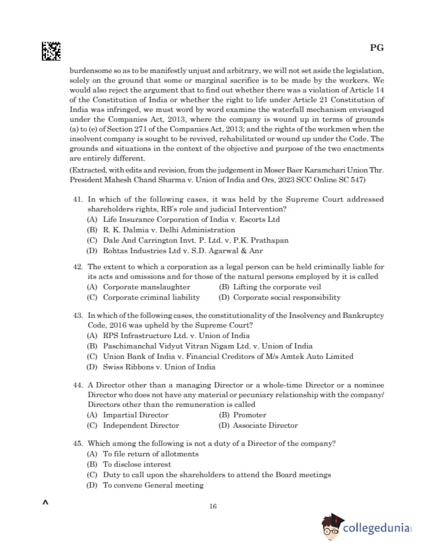 Comprehension: Read MoreSection 271 of the Companies Act, 2013 allows winding up of companies on specific grounds, including those unrelated to financial distress, such as special resolutions or fraudulent conduct. In contrast, the IBC focuses on reviving insolvent companies through sacrifices by all stakeholders, including workmen, secured creditors, and the government, to achieve survival and regeneration. These distinct frameworks cannot be equated when examining alleged violations of Article 14 or Article 21 of the Constitution. The waterfall mechanism under the IBC ensures fairness in allocating proceeds during insolvency but differs in purpose and application from the Companies Act provisions. The judgment in *Moser Baer Karamchari Union v. Union of India (2023)* highlighted that the objectives of these two laws are distinct, addressing different circumstances and requiring separate judicial interpretations. (A) Life Insurance Corporation of India v. Escorts Ltd (B) R. K. Dalmia v. Delhi Administration (C) Dale And Carrington Invt. P. Ltd. v. P.K. Prathapan (D) Rohtas Industries Ltd v. S.D. Agarwal & Anr |