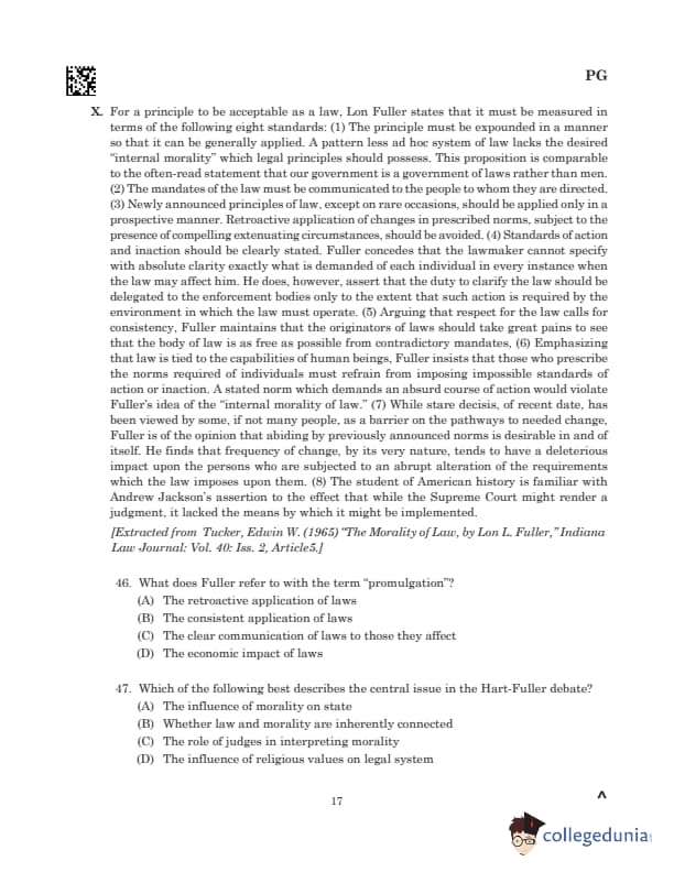 | 47. Which of the following best describes the central issue in the Hart-Fuller debate? (A) The influence of morality on state (B) Whether law and morality are inherently connected (C) The role of judges in interpreting morality (D) The influence of religious values on legal system |