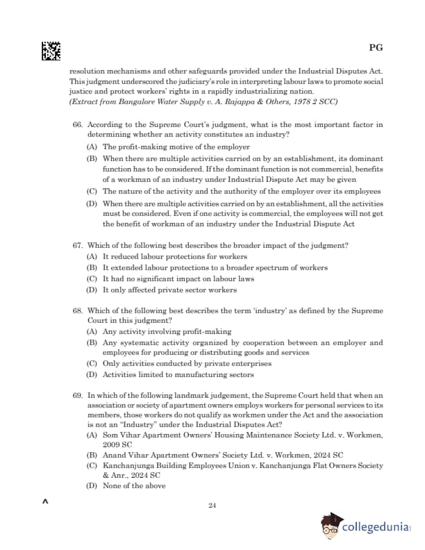 Comprehension: Read MoreWe cannot allow our judicial thinking to be constricted by reference to the law as it prevails in England or any other foreign country. While we are open to insights from foreign sources, we must build our own jurisprudence. The argument that new law does not recognize strict and absolute liability cannot deter us from adopting it. Enterprises engaged in hazardous or inherently dangerous activities must conduct them with the highest safety standards. The court also discussed the scope of Epistolary jurisdiction, emphasizing that procedural hurdles should not impede access to justice, as procedure is merely a handmaid of justice. (A) Fertilizer Corporation Kamgar Union v. Union of India, 1981 SC (B) Mumbai Kamgar Sabha v. Abdul Bhai, 1976 SC (C) ADM Jabalpur v. Shivkant Shukla, 1976 SC (D) Amba Devi v. Union of India, 1984 SC |