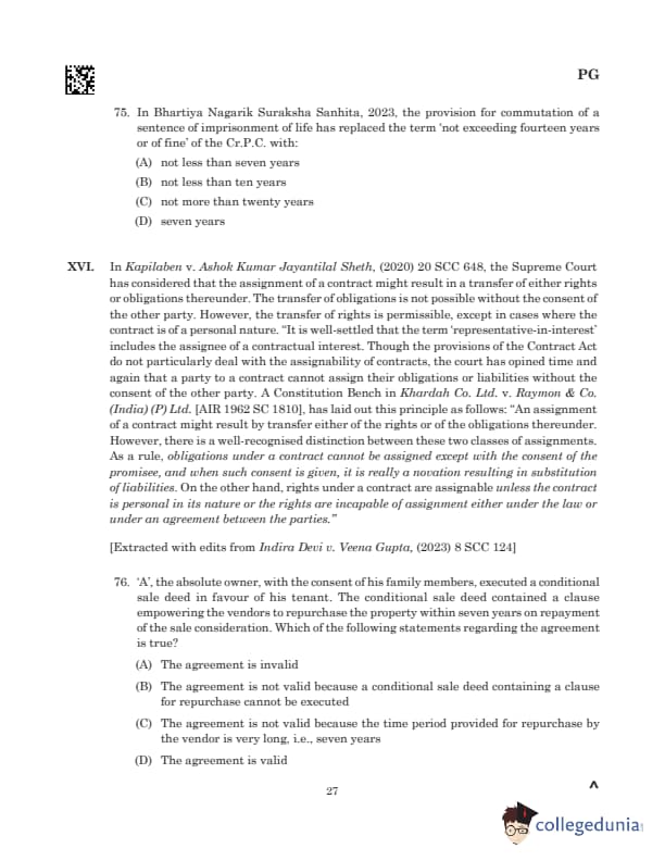Comprehension: Read MoreThe term "representative-in-interest" includes the assignee of a contractual interest. While the Contract Act does not explicitly address assignability, courts have consistently held that obligations cannot be assigned without the consent of the promisee. This principle, highlighted in *Khardah Co. Ltd. v. Raymon & Co. (India) (P) Ltd. (1962)*, states that such consent results in novation, effectively substituting liabilities. Conversely, rights under a contract are assignable unless the contract is personal in nature or assignment is restricted by law or agreement. These principles ensure clarity in handling contractual interests while respecting the original intent of the parties. (A) The agreement is invalid (B) The agreement is not valid because a conditional sale deed containing a clause for repurchase cannot be executed (C) The agreement is not valid because the time period provided for repurchase by the vendor is very long, i.e., seven years (D) The agreement is valid |
