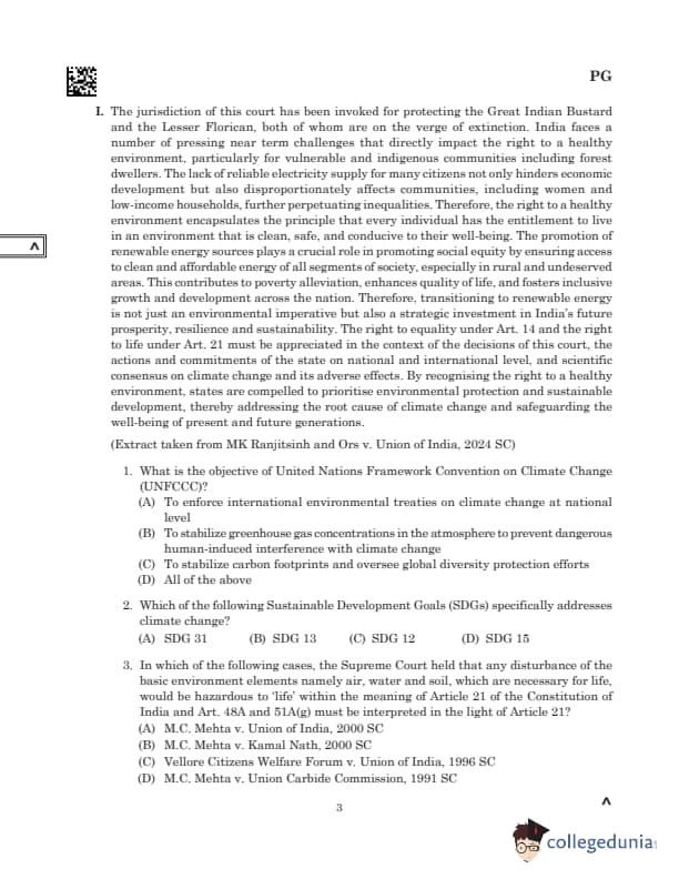 Comprehension: Read MoreThe lack of reliable electricity supply for many citizens not only hinders economic development but also disproportionately affects communities, including women and low-income households, further perpetuating inequalities. Therefore, the right to a healthy environment encapsulates the principle that every individual has the entitlement to live in an environment that is clean, safe, and conducive to their well-being. The promotion of renewable energy sources plays a crucial role in promoting social equity by ensuring access to clean and affordable energy for all segments of society, especially in rural and underserved areas. This contributes to poverty alleviation, enhances quality of life, and fosters inclusive growth and development across the nation. Therefore, transitioning to renewable energy is not just an environmental imperative but also a strategic investment in India’s future prosperity, resilience, and sustainability. The right to equality under Art. 14 and the right to life under Art. 21 must be appreciated in the context of the decisions of this court, the actions and commitments of the state on the national and international levels, and scientific consensus on climate change and its adverse effects. By recognising the right to a healthy environment, states are compelled to prioritise environmental protection and sustainable development, thereby addressing the root cause of climate change and safeguarding the well-being of present and future generations. 1. What is the objective of United Nations Framework Convention on Climate Change (UNFCCC)? (A) To enforce international environmental treaties on climate change at national level (B) To stabilize greenhouse gas concentrations in the atmosphere to prevent dangerous human-induced interference with climate change (C) To stabilize carbon footprints and oversee global diversity protection efforts (D) All of the above |