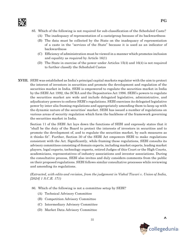 Comprehension: Read MoreSection 11 of the SEBI Act mandates SEBI to protect investor interests, regulate the securities market, and promote its development through necessary measures. Section 30 empowers SEBI to frame regulations consistent with the Act. SEBI exercises wide-ranging powers, including delegated legislative, administrative, and adjudicatory powers, to enforce its regulations. These regulations form the backbone of India’s securities market framework. SEBI follows a consultative process while framing and amending regulations, involving advisory committees with experts, market players, retired judges, academicians, and representatives from industry and investor associations. The process includes public consultation, ensuring transparency and adaptability in regulating the dynamic securities market. (A) Technical Advisory Committee (B) Competition Advisory Committee (C) Intermediary Advisory Committee (D) Market Data Advisory Committee |