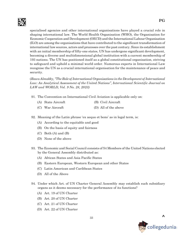 Comprehension: Read MoreAs described by Henkin, international organisations represent "new laws at its birth." The UN Charter and agencies such as the WHO, OECD, and ILO have transformed the sources, actors, and processes of international law. Since its inception with 51 member states, the UN has grown to 193 members, evolving into a diverse institution that safeguards global order. Recognised as a global constitutional organisation, the UN is crucial for maintaining international peace and security. These organisations have profoundly impacted the evolution and functionality of international law over the past century. (A) State Aircraft (B) Civil Aircraft (C) War Aircraft (D) All of the above |